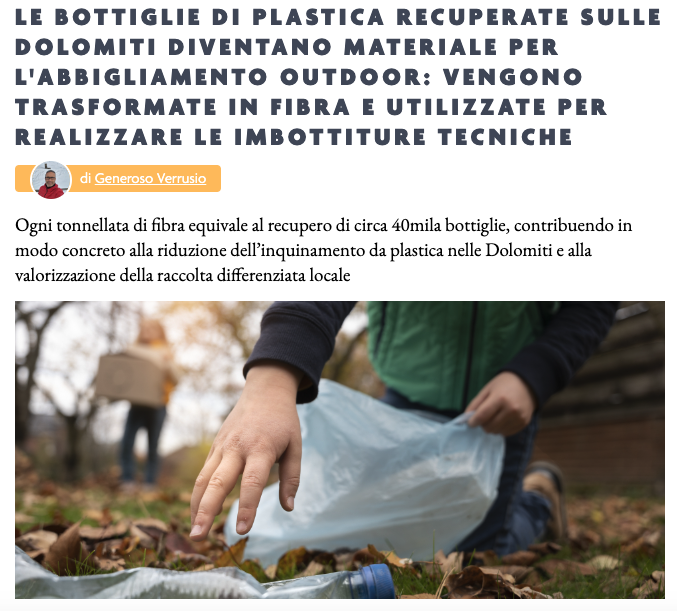 Le bottiglie di plastica recuperate sulle Dolomiti diventano materiale per l'abbigliamento outdoor: vengono trasformate in fibra e utilizzate per realizzare le imbottiture tecniche