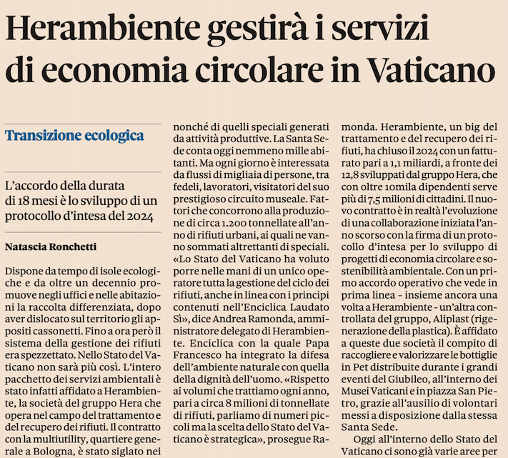 Herambiente gestirà i servizi di economia circolare in Vaticano