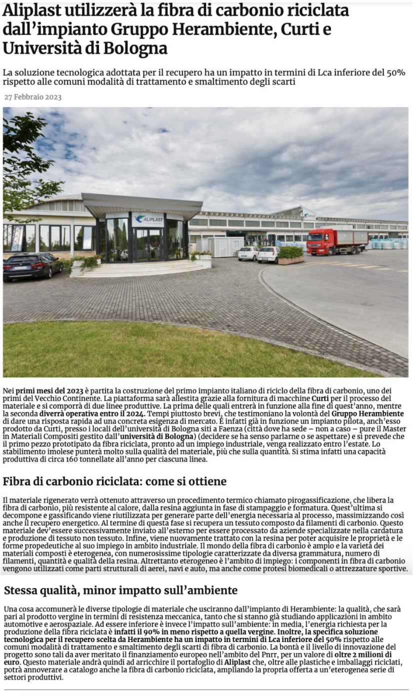 Aliplast utilizzerà la fibra di carbonio riciclata dall’impianto Gruppo Herambiente, Curti e Università di Bologna